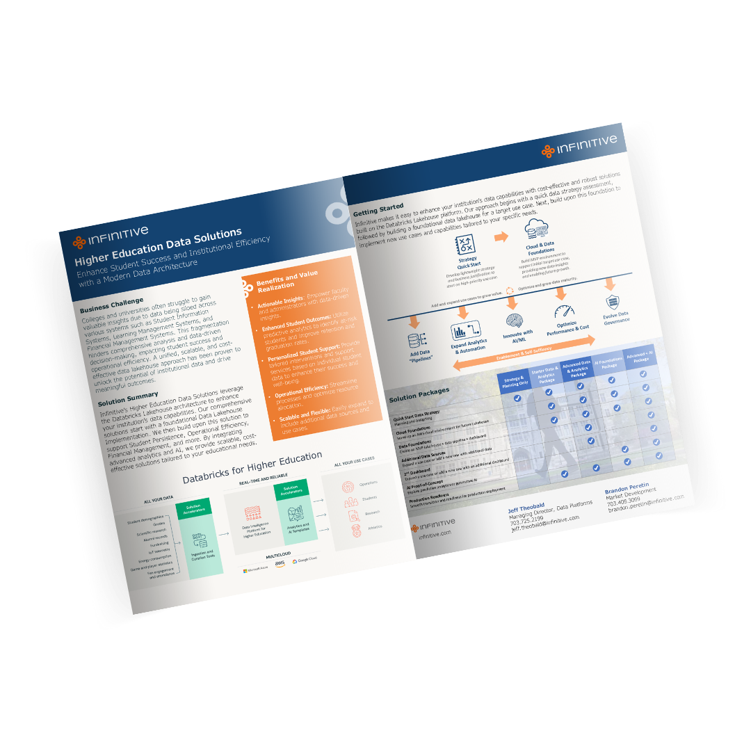 Get the help you need to start your cloud and analytics journey with our Higher Education Data Solutions to define your vision and secure appropriate budget.