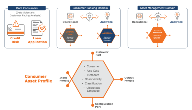 i. Data product is an autonomous, standardized data unit containing at least one data set to satisfy user needs. The figure below shows two domains – consumer banking and asset management. Consumer banking domain has two data products – consumer credit card profile and consumer demographics. Asset management domain has one data product – consumer asset profile.