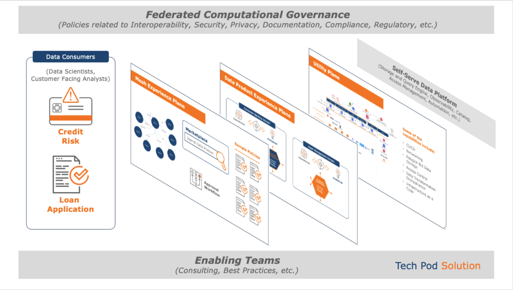 The figure above depicts the data mesh architecture through a data lens. As shown, the data platform is comprised of three planes – the mesh experience plane for new platform interfaces and capabilities, the data experience plane for all the domain-driven data product development cycle management, and the utility plane for infrastructure as a code automation.