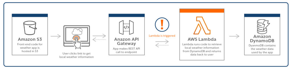 If we have a web application which allows a user to access the application and receive the weather forecast in their area, AWS Lambda can be used as a serverless FaaS to perform the backend application logic. Our user visits the site hosted in S3, clicks the button to get their weather information which makes an API call to API Gateway. This API call triggers the serverless AWS Lambda which will perform the task of retrieving the local weather information from DynamoDB and returns it to the user on the front-end. In this example of a serverless FaaS used in an application, AWS Lambda was triggered by the event of the user clicking the button which made an API call.